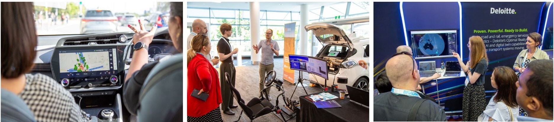Above: Live demonstrations in action at the 2025 ITS Australia Summit on the Gold Coast. L-R: Lexus, Queensland University of Technology, Deloitte.